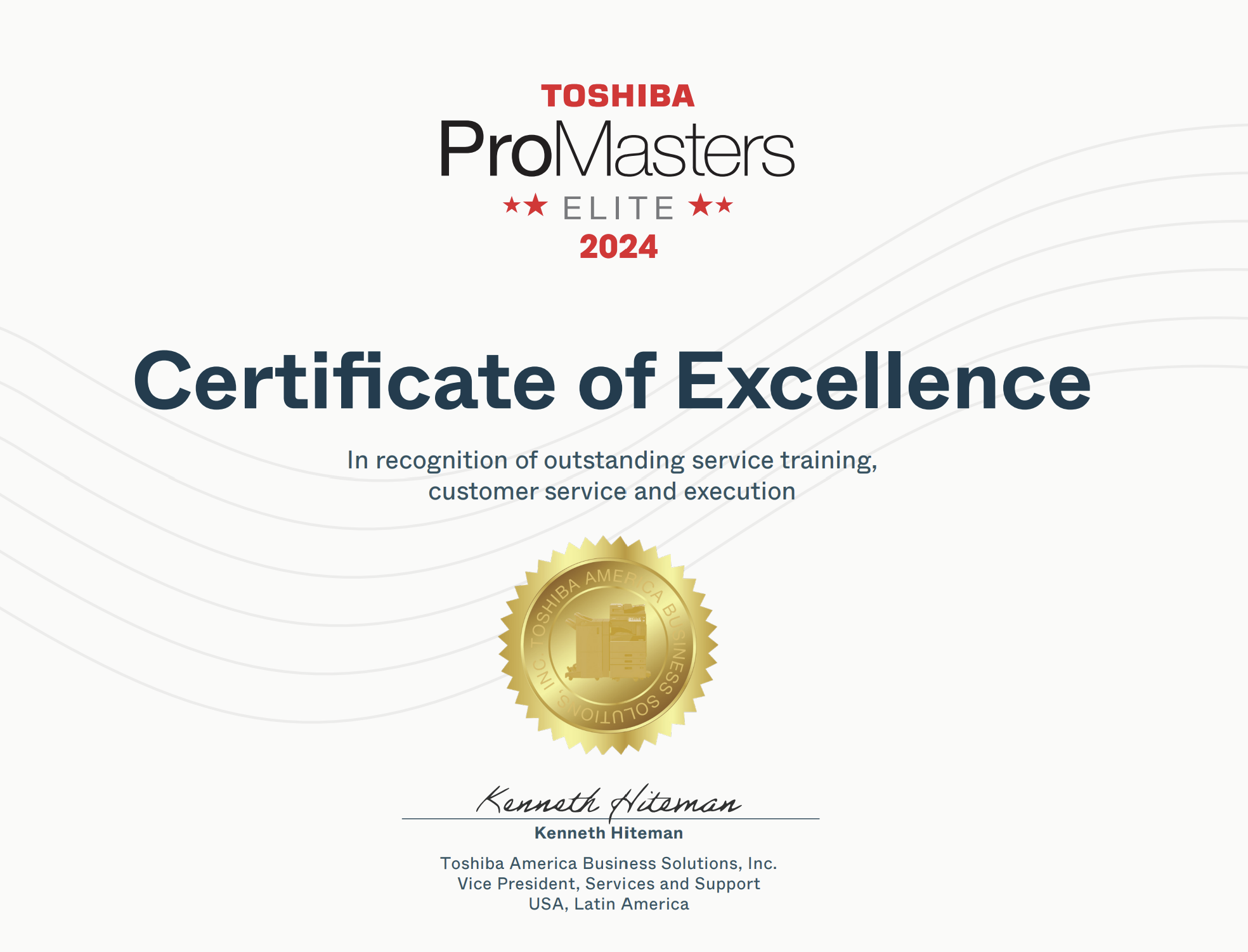 A&B Business Solutions has once again been recognized as the Toshiba ProMasters Elite Certified Dealer. Achieving the Toshiba ProMasters Elite Certified Dealer status is a significant milestone, reflecting a dealership’s unwavering commitment to excellence in service and support. This prestigious designation is not just a testament to the quality of service provided but also to the dedication to continuous improvement and training that sets a dealer apart in the competitive landscape of Toshiba product servicing.
